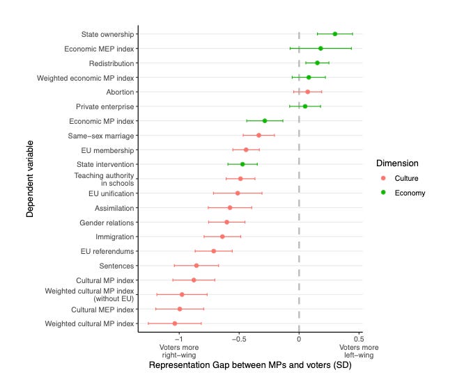 Another perhaps surprising finding is that there is much less of an elite-public gap on economic issues. If anything, politicians are more inclined to support free markets. Hanania asks whether the gap might be even greater than the paper suggests, given the way questions are framed. This helps explain why left-wing populism hasn’t been as successful as its right-wing equivalent, whether in the US or Europe.